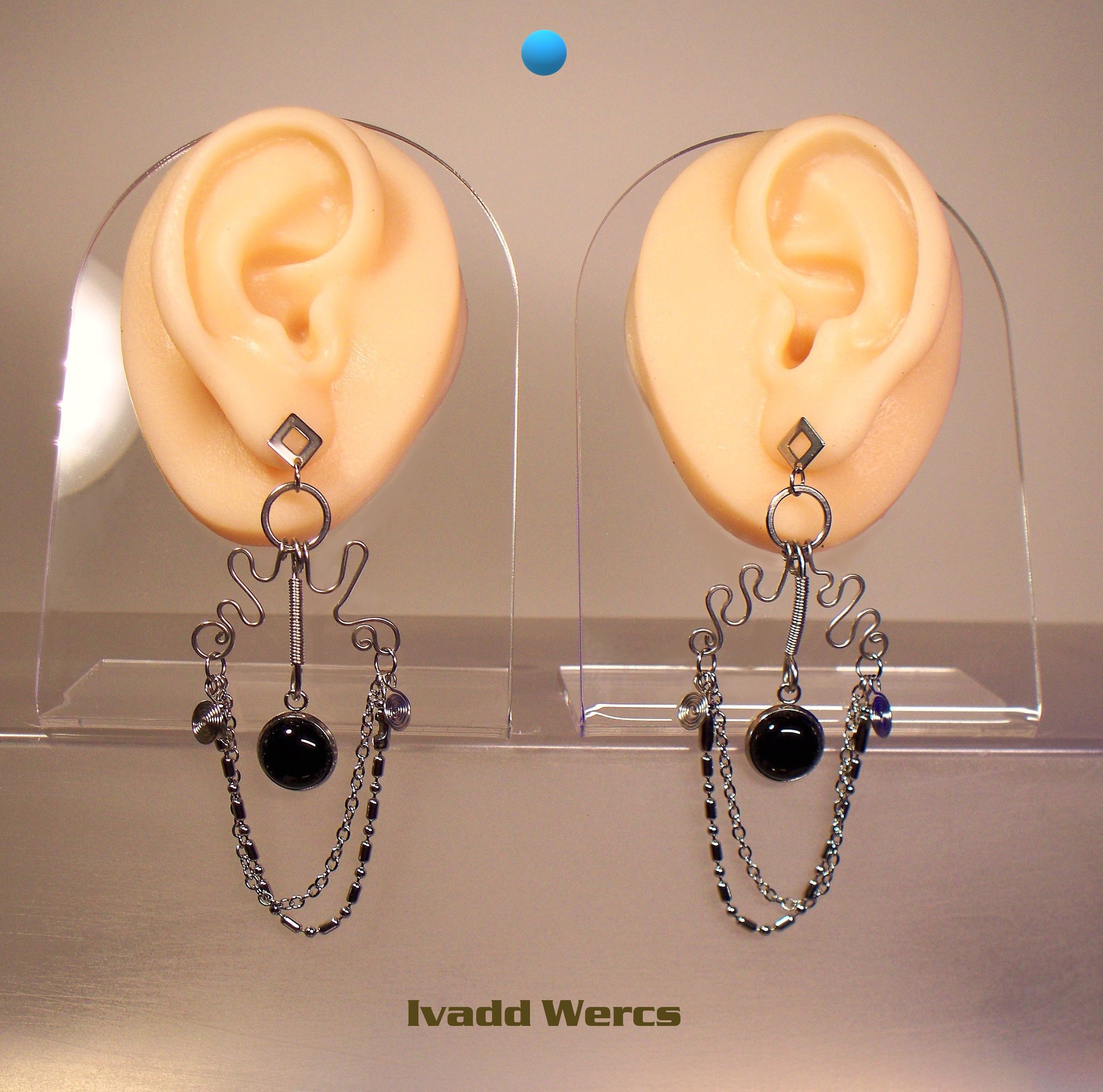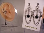 These fun earrings with black onyx are 100% 304 hypoallergenic and jewelry grade stainless steel. Lightweight and stainless steel tough while looking delicate, these earrings with chains a diamond shaped tops stand alone but worn with one of my original ear cuffs as seen in some of these photos complete another look.