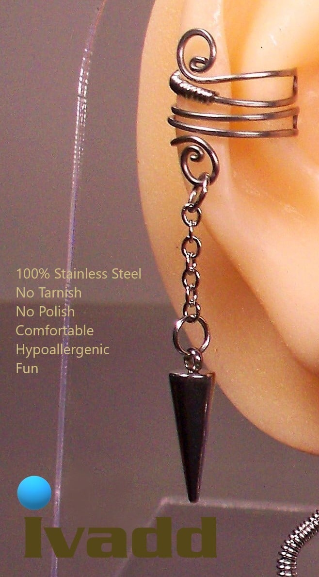 Ear Cuff for Men and Women. 100% 304 jewelry grade stainless steel with coiled spiral cuff and stainless steel chain and spike dangle.