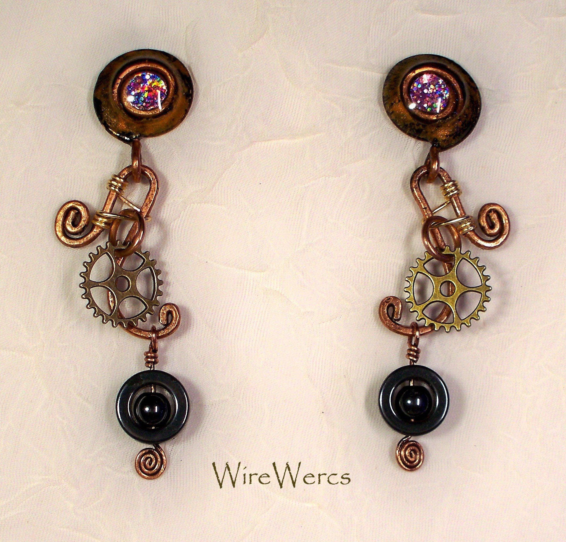 Copper, bronze, glass and hematite. Holographic or prismatic topper under glass with surgical steel polished post and silicone backers for extra comfort.