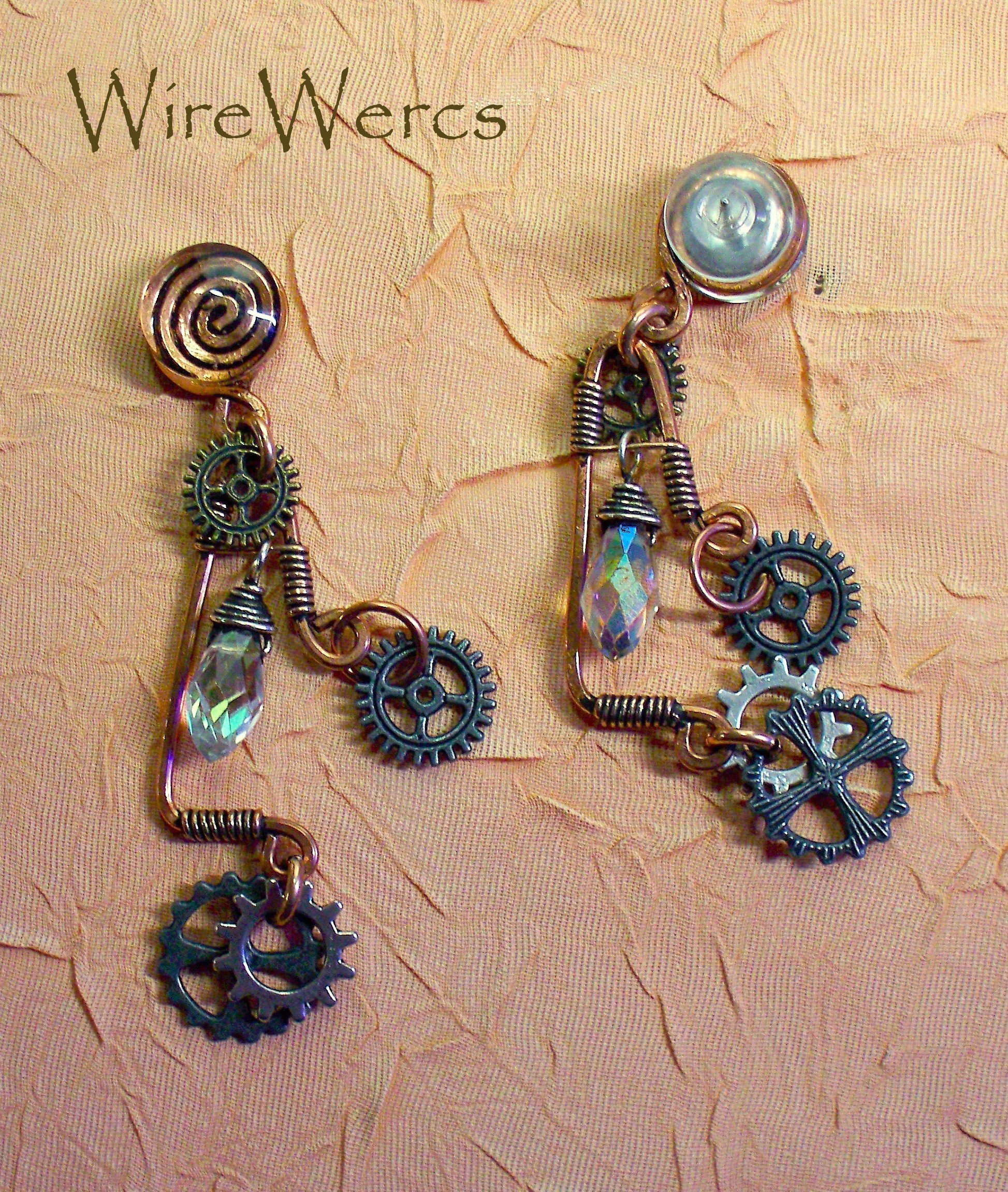 Copper, Austrian crystals, gears and Steampunk style have these amazingly lightweight earrings with hypoallergenic surgical steel posts and silicon backs for a comfort fit behind the glass topped copper coil toppers.