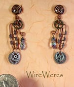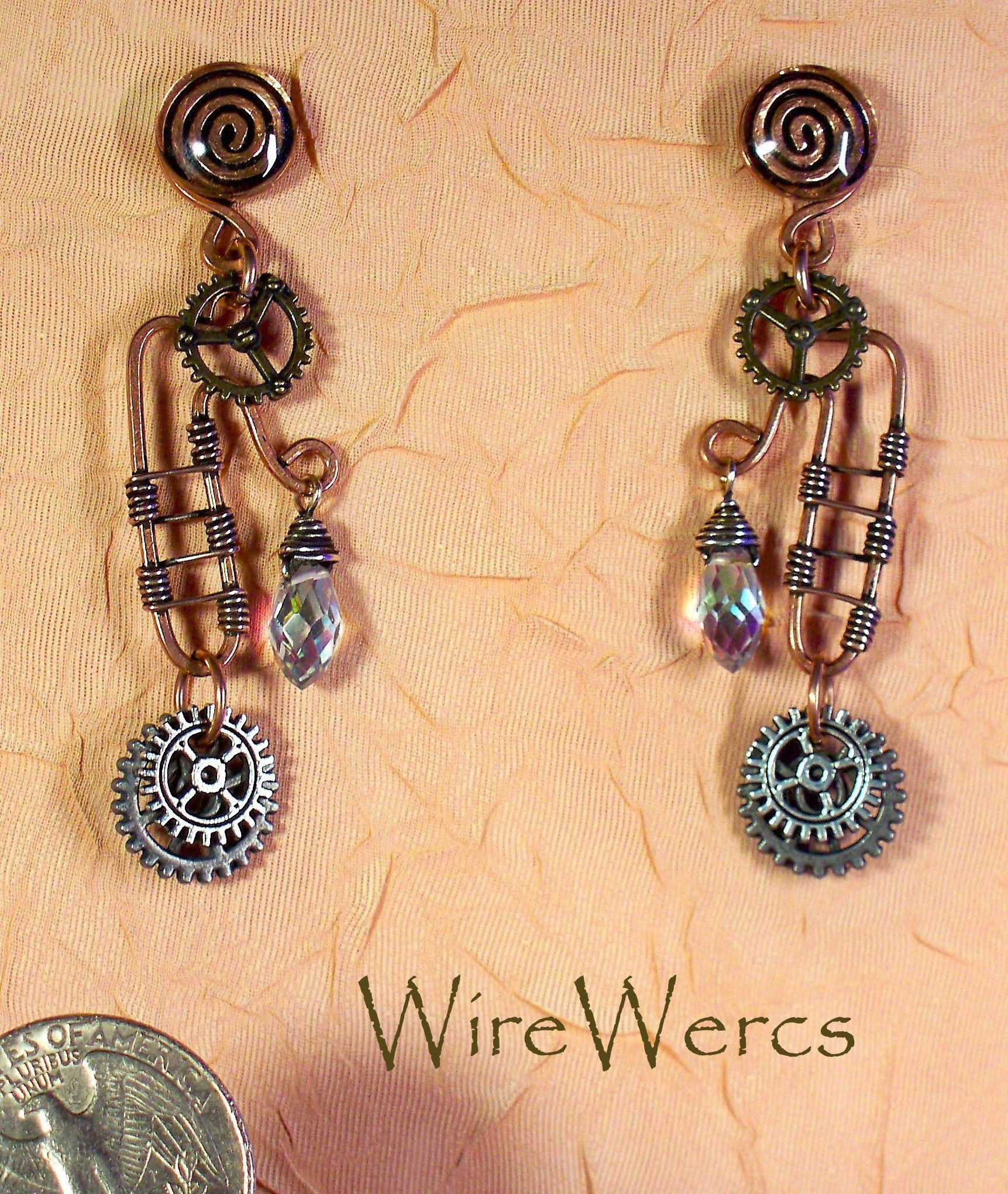 Copper wire with Austrian crystals and Steampunk style. Lightweight, fun and eye catching. Surgical steel posts with silicon backs for comfort.