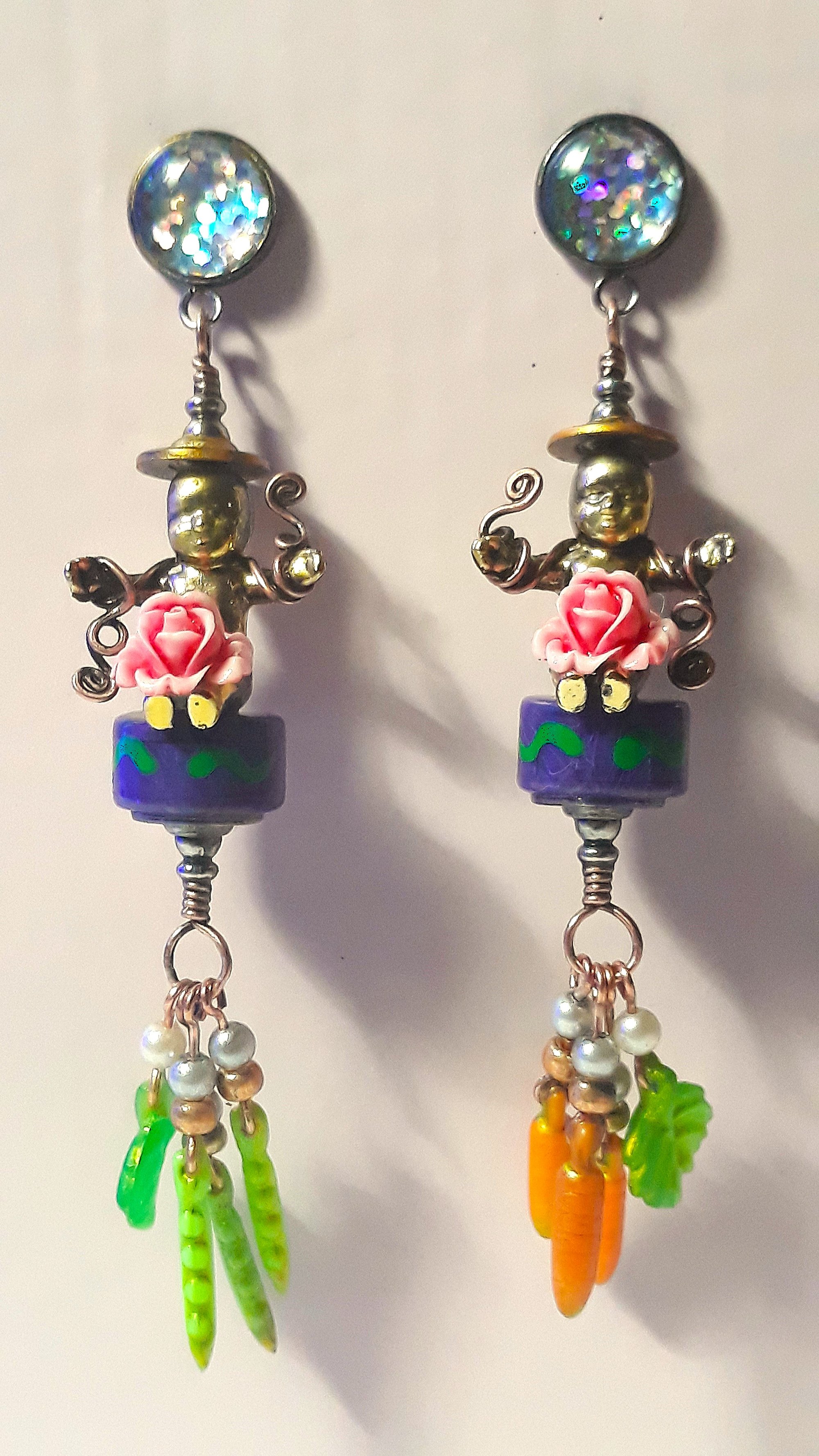 Babies with peas, carrots and flowers. Holographic light throwing surgical steel post behind the glassed topped spiraled coils. Peas and carrots anyone?