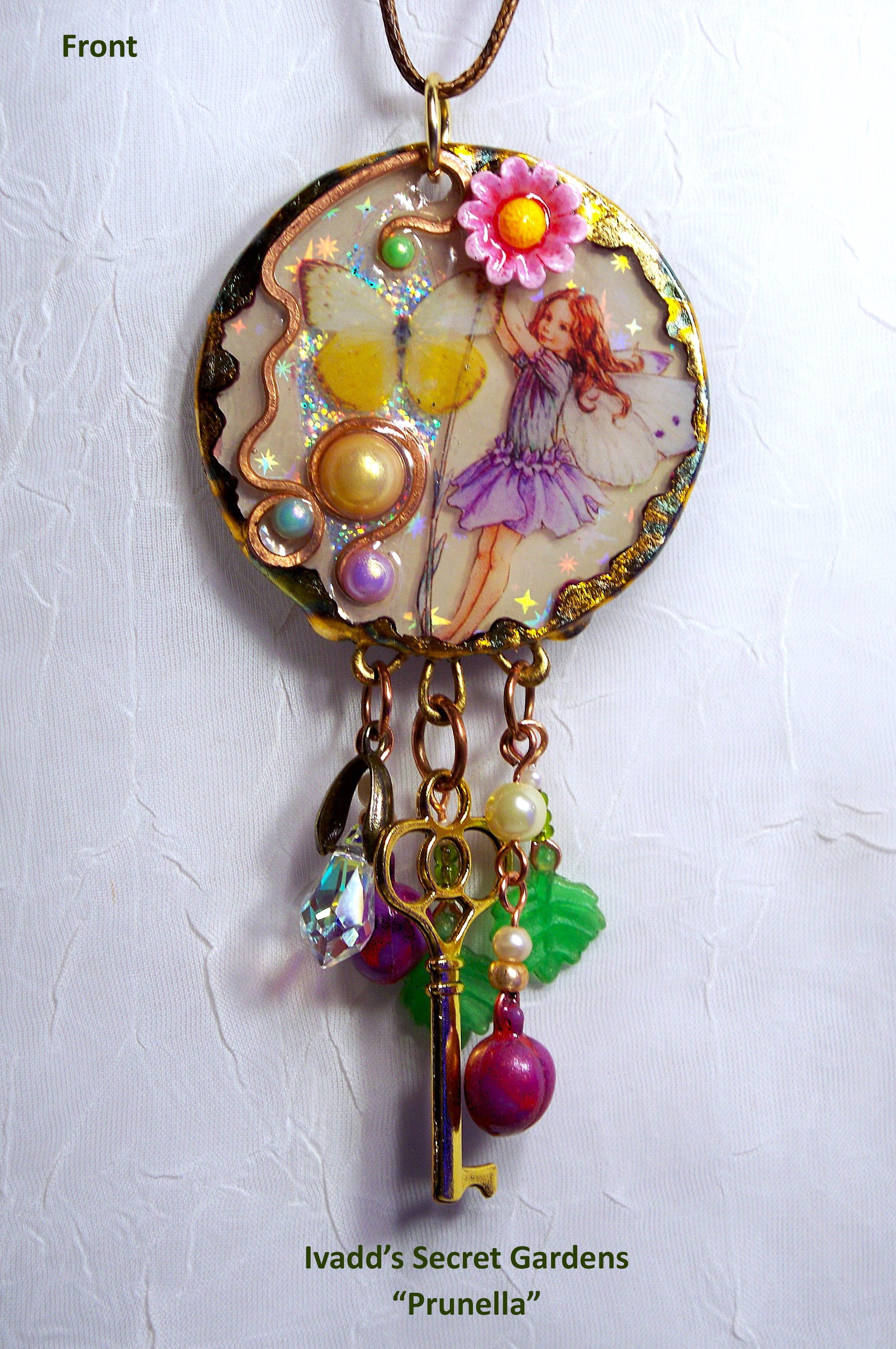 New pendants utilizing many materials with added layers of holographic films in the layers that cast changing prismatic light with every move. Hand painted and more. Each one holds a magical key that opens the gardens gates.