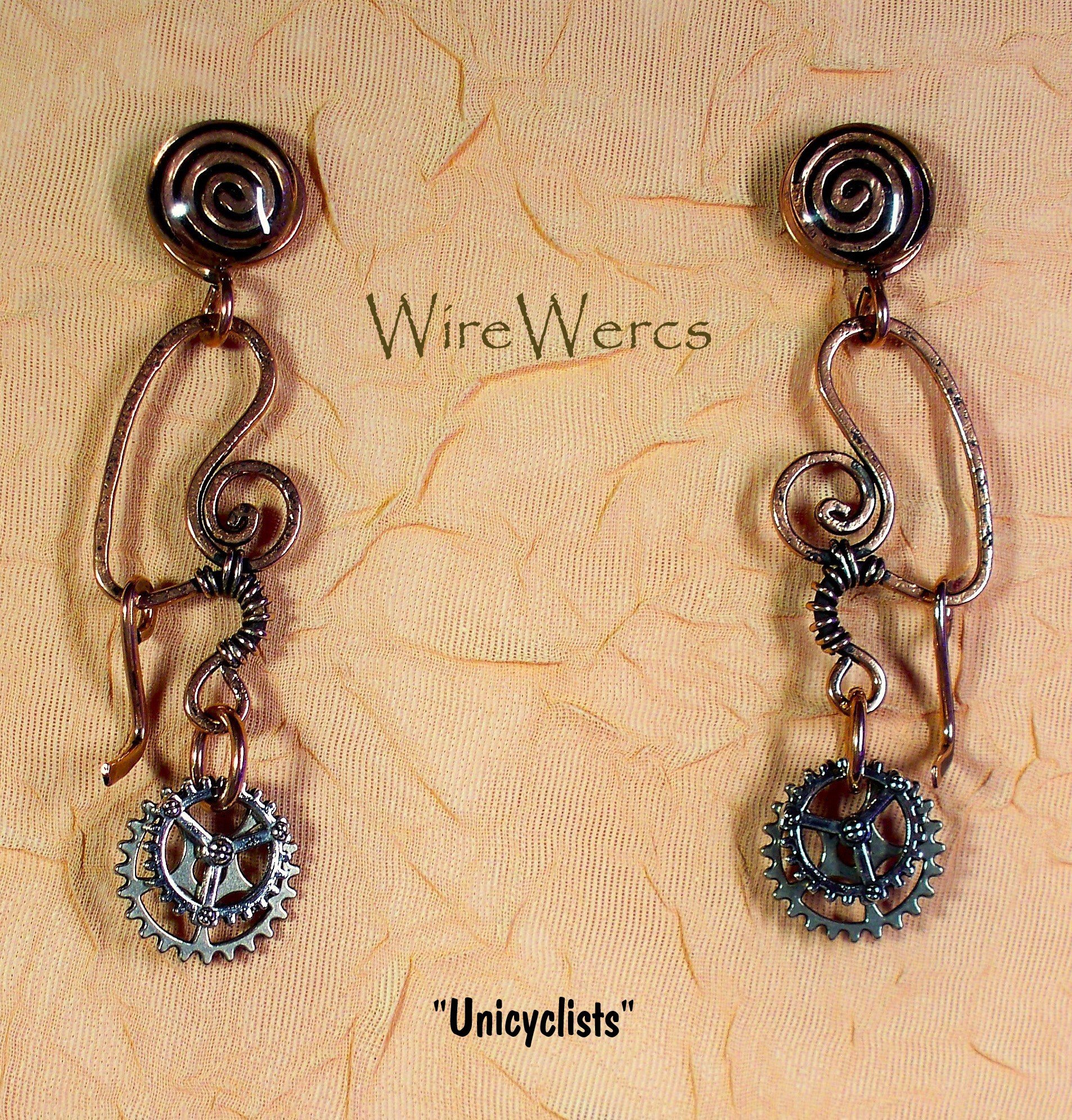 "Unicyclists" Copper with Gears Earrings with Steampunk Style.