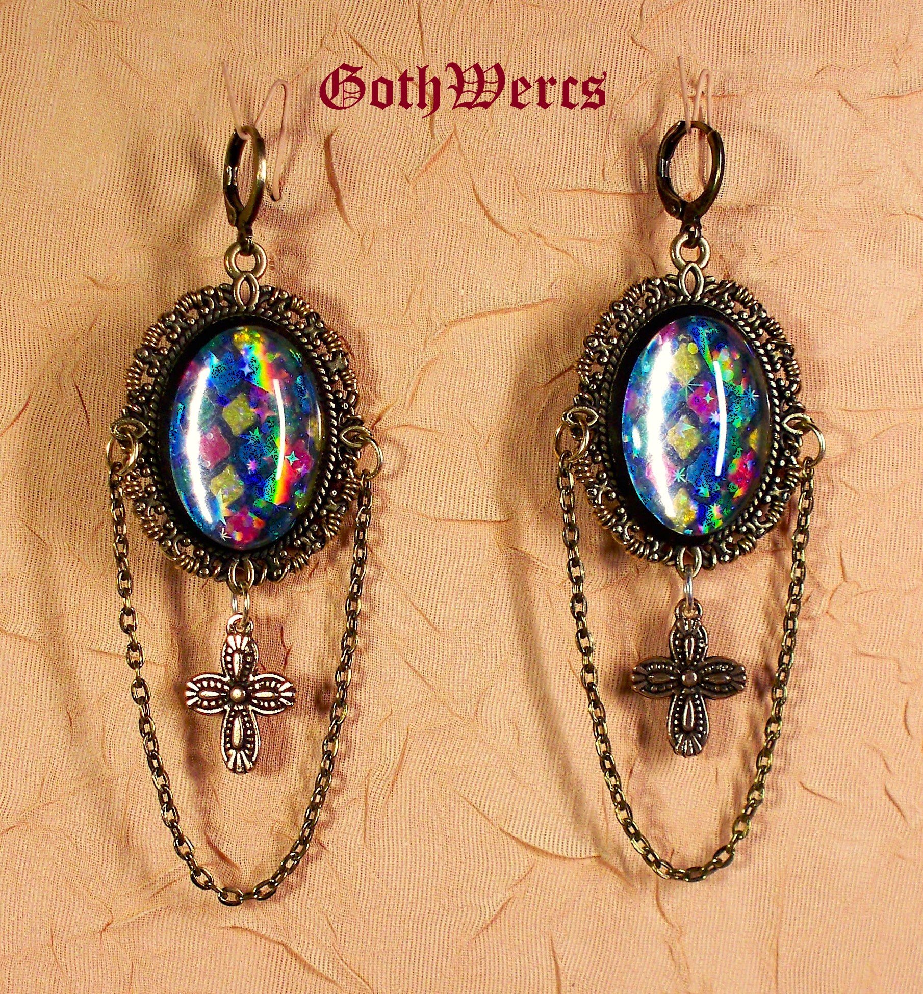 Victorian Gothic Steampunk Earrings with Holographic Glowing Stained Glass 'Windows'.